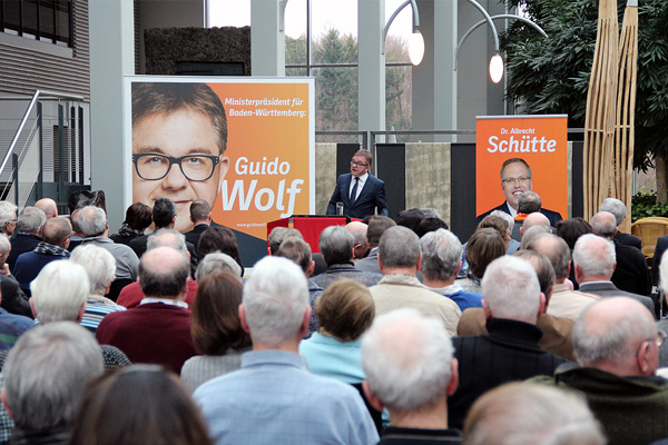 Selbstverständlich ging auch Landtagskandidat Dr. Albrecht Schütte mit Blick auf den Wahltermin 13. März auf die zentralen landespolitischen Themen ein. „Es war immer unser Ziel, Nummer eins der Bundesländer zu sein und nicht im Mittelfeld zu spielen.“ Inzwischen sei Baden-Württemberg zum Beispiel bei der Schulabbrecherquote sogar hinter Hessen zurückgefallen. Die Qualität der Schulen und Schulabschlüsse müsse zukünftig wieder im Mittelpunkt stehen. Auch bei den Investitionen in die Infrastruktur habe Grün-Rot die letzten fünf Jahre viel zu wenig getan. Daher werde die CDU 500 Millionen in das schnelle Internet und 1 Milliarde Euro in neue Straßen investieren.