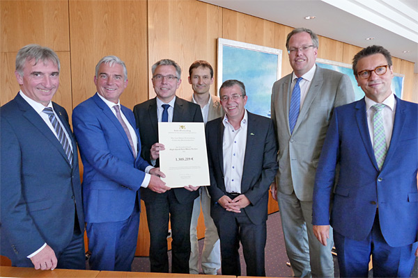 Karl Klein MdL, Minister Thomas Strobl, Landrat Stefan Dallinger, Hermino Katzenstein MdL, Peter Mülbaier (Geschäftsführer des Zweckverbandes High-Speed-Netz Rhein-Neckar), Dr. Albrecht Schütte MdL und Minister Peter Hauk MdL bei der feierlichen Übergabe des Bescheids in Stuttgart.