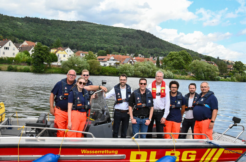 Im Rahmen der Ehrenamtstour war der nächste Stopp der DLRG Neckargemünd. Auf dem Wasser tauschten sich Hagel und Schütte sowie der Bundestagsabgeordnete Moritz Oppelt mit Detlev Sy, Vorsitzender des Vereins, und weiteren Mitgliedern über die Aufgaben der Deutschen Lebens-Rettungs-Gesellschaft (DLRG) aus.