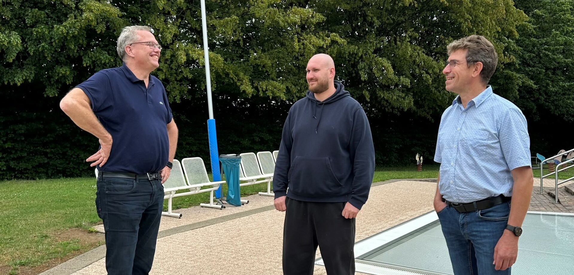 Im Rahmen seiner Wahlkreiswoche besuchte der Landtagsabgeordnete Dr. Albrecht Schütte (CDU) die Freibäder in Sinsheim und Reichartshausen. Bei regnerischem Wetter blieb viel Zeit zum Austausch für die Träger mit Andreas Uhler und Bürgermeister Gunter Jungmann sowie mit den Badleitern in Sinsheim und in Reichartshausen. Für Albrecht Schütte, der selber im heimischen Freibad für die Sicherheit im Wasser sorgt, war es ein Highlight, die Technik in den Bädern zu besichtigen und zu speziellen Fragen rund um technische Ausstattung, Sanierungsstand und die Personalgewinnung zu sprechen.
