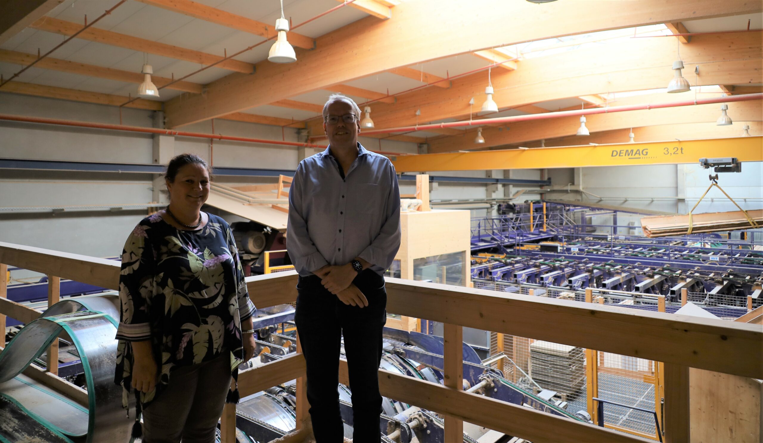 Abschließend führte Blanca Mayer den Abgeordneten durch das Sägewerk. Schütte war von der Sägeanlage, die mit verschiedenen Maschinen eine ganze Halle füllt, sehr beeindruckt und erkundiget sich nach Abfällen bei der Produktion. „Es gab noch nie Abfälle, im Sägewerk wurde schon immer alles aus dem Stamm verwendet. Alles, was nicht als Balken oder Bretter die Anlage verlässt, nennt man Resthölzer wie z.B. Hackschnitzel, die wie folgt verwendet werden können für das örtliche Heizkraftwerk am Gymnasium, zur Papierproduktion oder als Spielplatzbelag.“, war die Antwort der Betriebsinhaberin.