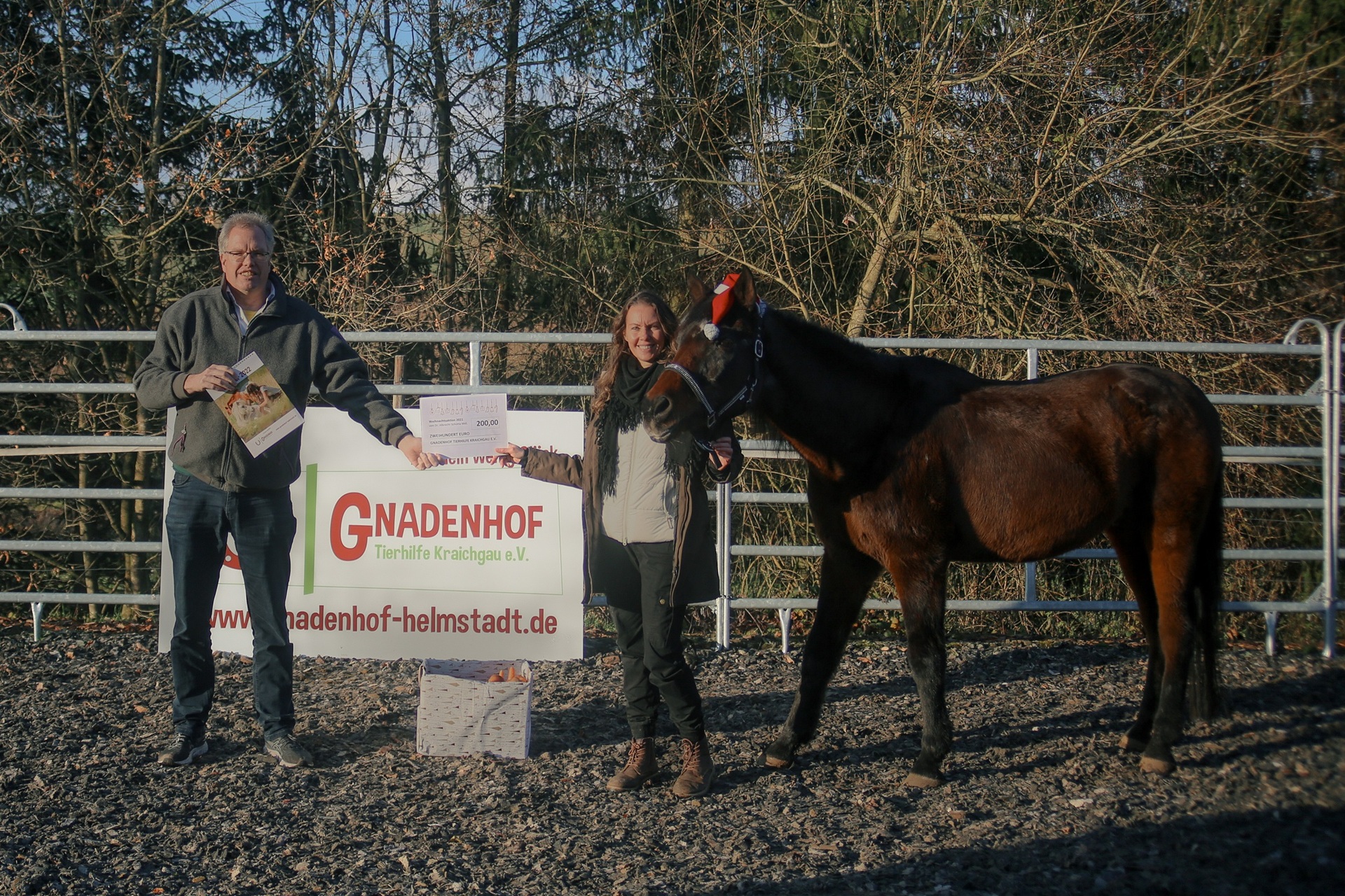 Ein tragisches Ereignis war dem Besuch von Schütte vorangegangen: Erst am 29. November hatte man den ältesten Bewohner des Hofes verloren. Der 34 Jahre alte Gino musste nach acht Jahren in der Herde über die Regenbogenbrücke gehen. Ein kleines Andecken an den tollpatschigen Herdenanführer ist im diesjährigen Gnadenhofkalender zu finden, denn dort ist er mit Bild und einer kleinen Geschichte verewigt.