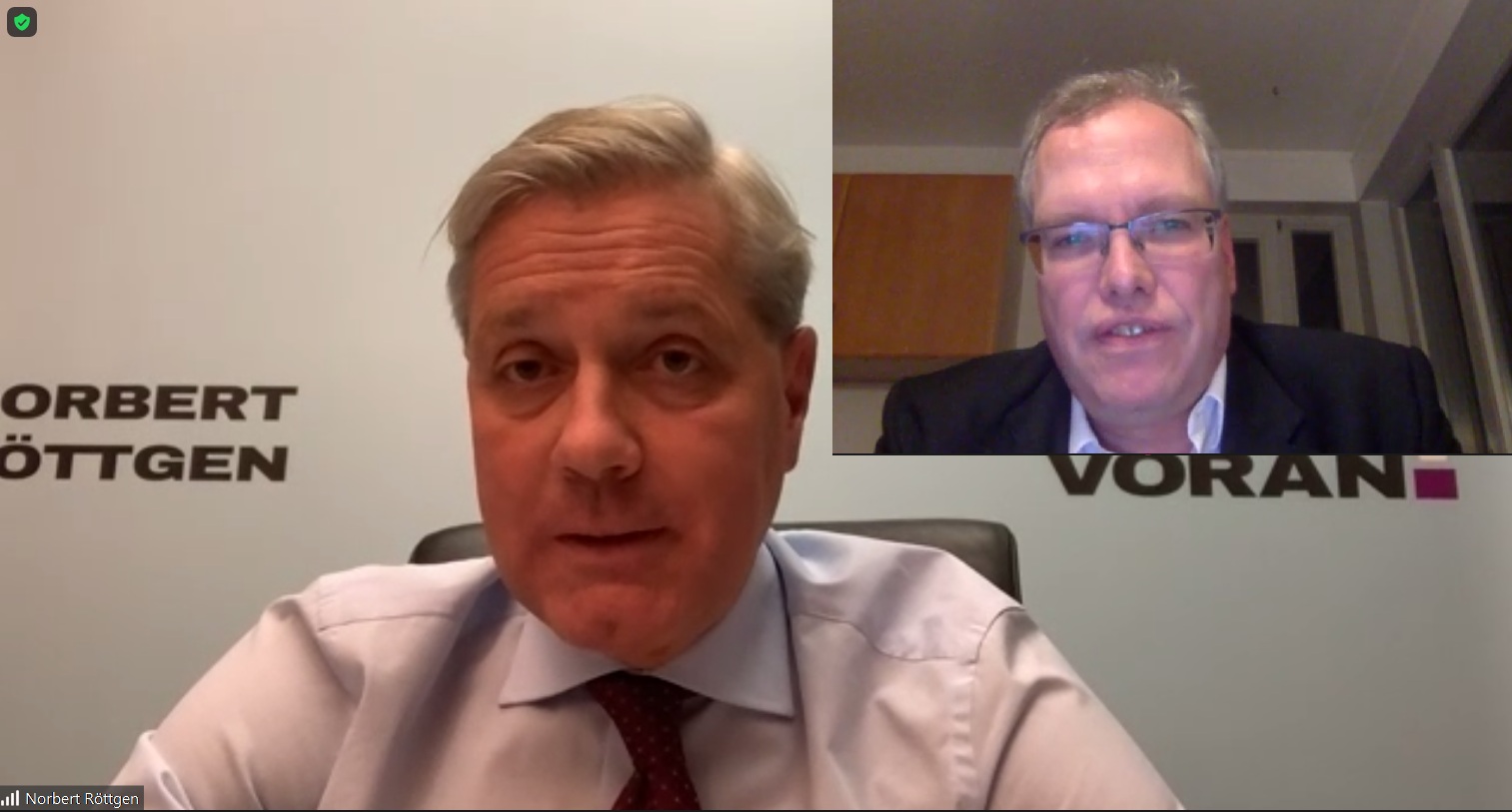 Nach der kurzen Vorstellung durch den Kandidaten bot sich den Teilnehmern der Videokonferenz anschließend die Möglichkeit, Fragen an Norbert Röttgen zu stellen. Ein Schwerpunkt der Diskussion war dabei die Außenpolitik – Röttgen ist seit 2014 Vorsitzender des Auswärtigen Ausschusses des Deutschen Bundestages – insbesondere die Frage nach der Antwort Deutschlands auf die Herausforderungen im Umgang mit China und Russland. Röttgen betonte dabei, wie wichtig eine gemeinsame europäische Antwort auf ebendiese Herausforderungen sei, im Zweifel müsse man vom Einstimmigkeits-Prinzip abweichen: „Die Europäische Union muss endlich ein außenpolitischer Akteur werden. Dazu muss eine Gruppe von Willigen vorangehen und europäische Ergebnisse in der Außenpolitik liefern – die 27 werden es nicht sein.“