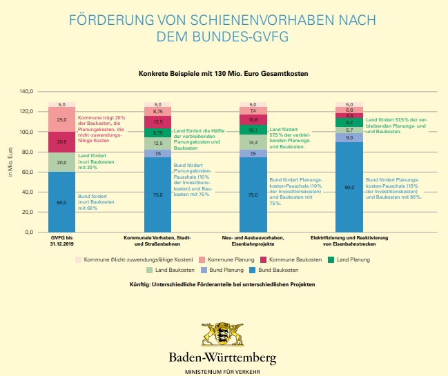Seit diesem Jahr fördert der Bund über das sogenannten Gemeinde-Verkehrs-Finanzierungs-Gesetz (GVFG) die Reaktivierung oder Elektrifizierung einer Eisenbahnstrecke mit 90% der Baukosten und für die Planung einem pauschalen Zusatz von 10%. Damit wurde die Förderquote gegenüber dem letzten Jahr um über 30% erhöht. Damit werden auf Landesseite Mittel frei, die nun verwendet werden, um den verbleibenden Teil der Finanzierung mit 57,5% zu fördern.