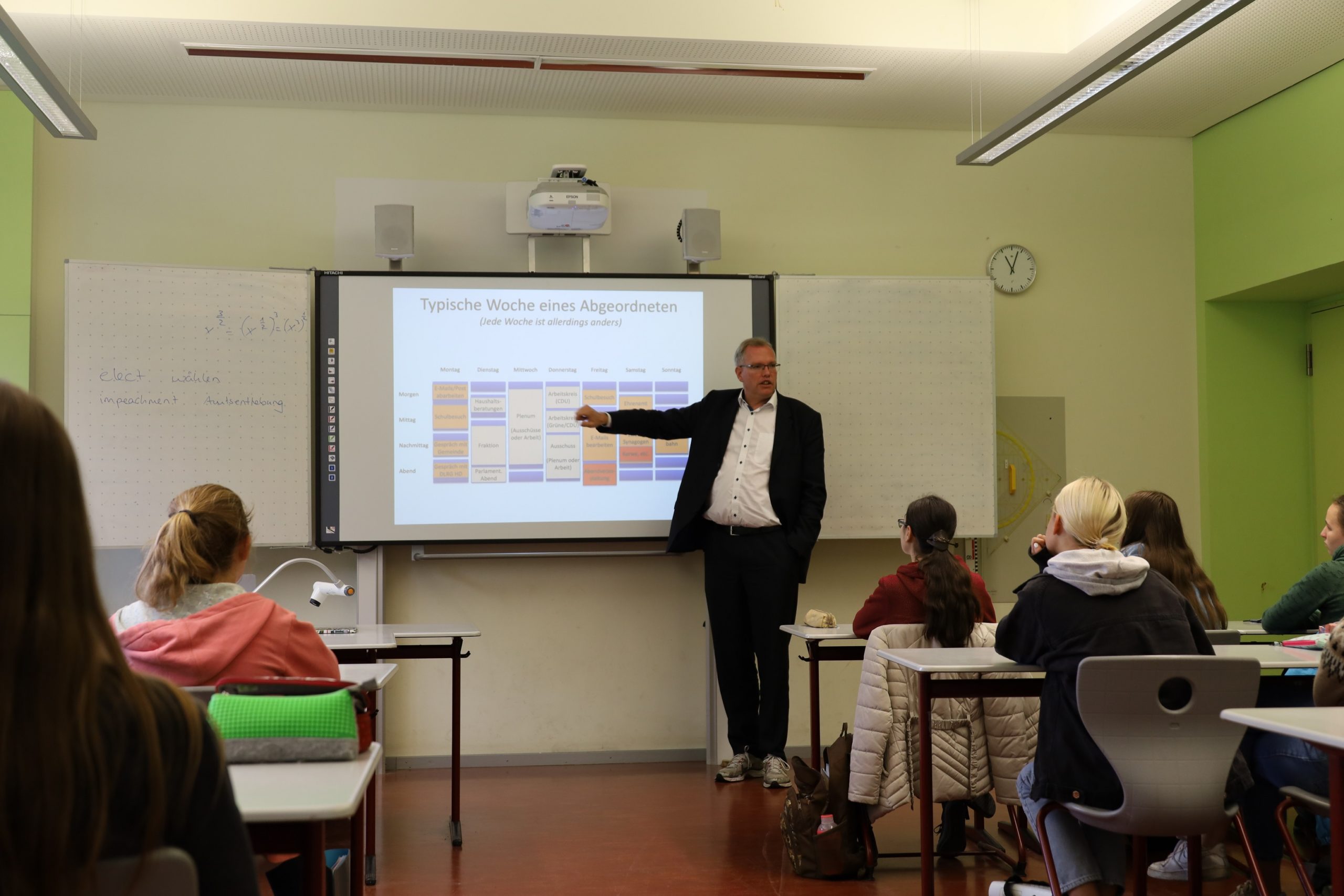Nach dem konstruktiven Gespräch mit der Schulleitung der Realschule besuchte Schütte anschließend, unter Einhaltung des Corona-Mindestabstandes, den Gemeinschaftskunde-Unterricht der Klasse 10 des Max-Born-Gymnasiums, unterrichtet von Herrn Steininger. Neben einer kurzen Einführung in die Arbeit eines Landtagsabgeordneten, das Wahlsystem in Baden-Württemberg sowie Tätigkeitsschwerpunkte der Landespolitik stand vor allem die Diskussion mit den Schülerinnen und Schülern im Mittelpunkt der Schulstunde. Ein Thema der Diskussion war beispielsweise der Klimawandel, bzw. der Klimaschutz, für ihn mit das wichtigste Thema der nächsten Jahre und Jahrzehnte, so der Landtagsabgeordnete: „Als Physiker vertraue ich auf Fakten und Zahlen. Und diese sprechen hier eine eindeutige Sprache: Der menschengemachte Klimawandel ist erstens real und muss zweitens dringend durch effektive Maßnahmen verlangsamt, bzw. gestoppt werden.“ Dies müsse allerdings effektiv passieren, zum Beispiel durch einen Zertifikate-Handel, so dass dort CO2 eingespart werde, wo die Einsparung am leichtesten vorgenommen werden könne. Dass dieses Instrument funktioniere, zeige sich am Energiesektor, wo durch den europäischen Emissionzertifikate-Handel die Einsparungsziele erreicht werden konnten.