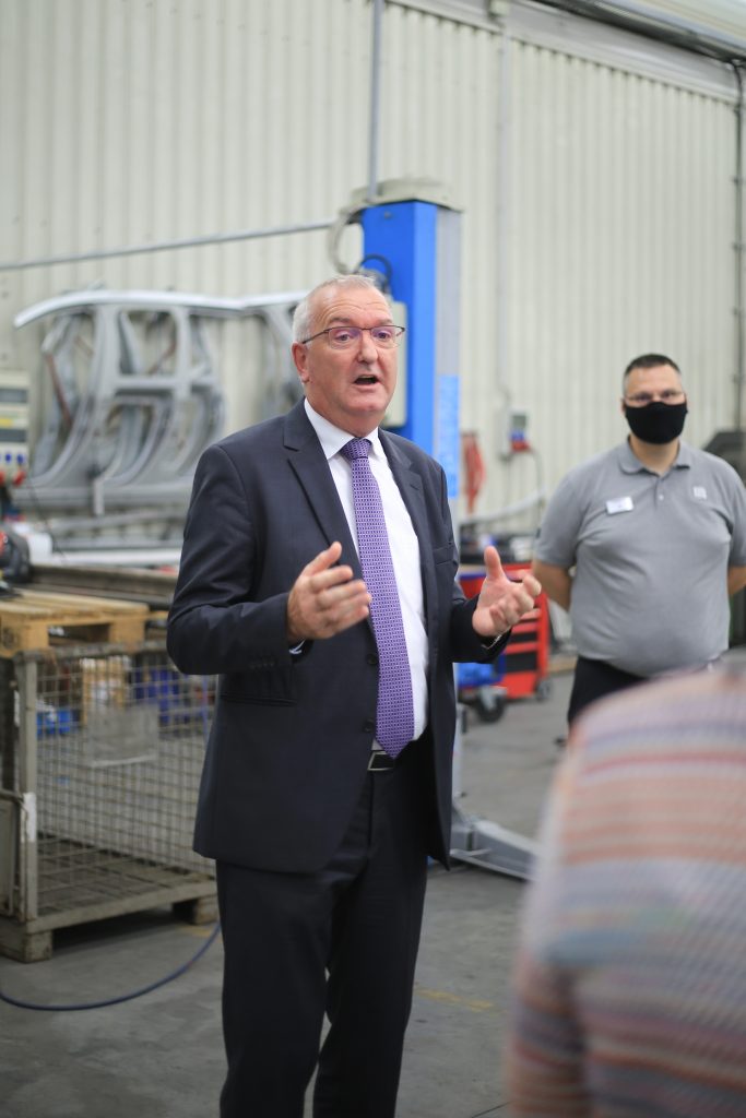 Anschließend machten sich Ministerin, Landtagsabgeordneter und Kommunalpolitik ein Bild von der Niederlassung des finnischen Entwicklungs- und Fertigungsdienstleisters „Valmet Automotive“. Deutschland-Geschäftsführer Dr. Robert Hentschel und Klaus Wetzstein, Betriebsleiter in Helmstadt-Bargen, stellten zunächst die Pläne für den Standort vor: „Hier in Helmstadt-Bargen wird zukünftig die Batterieentwicklung der „Valmet Automotive“-Gruppe stattfinden, ein echtes Zukunftsthema. Denn klar ist: Die Nachfrage nach elektrischen Kleinfahrzeugen wird mittelfristig deutlich zunehmen.“ Nach einem Rundgang durch die Produktionshallen, die bei laufdender Produktion momentan erweitert und modernisiert werden, bedankte sich Bürgermeister Jürriens bei Wirtschaftsministerin Dr. Hoffmeister-Kraut für die Bereitschaft, das Zapf-Gelände in Helmstadt-Bargen und die dort angesiedelten Unternehmen zu besichtigen.
