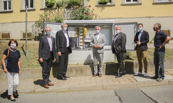 Bildunterschrift: v.l.n.r. Elke Brunnemer (MdL a.D.), Thomas Heusel (Zweckverband Fibernet), Dr. Albrecht Schütte MdL, Thomas Strobl (Digitalisierungsminister), Peter Hesch (1. Stellvertretender Bürgermeister), Florian Hummel (Stadtrat), Friedhelm Zoller (Fraktionsvorsitzender)
