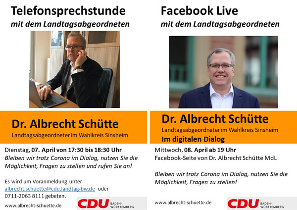 Als nächste feste Termine bietet der Abgeordnete eine Telefonsprechstunde am Dienstag, 7. April zwischen 17.30 und 18.30 Uhr und ist bei Facebook Live am Mittwoch, 8. April ab 18.30 Uhr online direkt erreichbar. Für die Telefonsprechstunde können sich Bürgerinnen und Bürger über albrecht.schuette@cdu.landtag-bw.de oder 0711-2063 8111 anmelden, um den genauen Termin abzusprechen. Natürlich bleibe er auch weiterhin zu anderen Zeiten erreichbar, so Schütte.