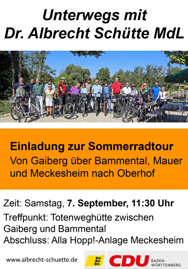Der Sinsheimer Landtagsabgeordnete Dr. Albrecht Schütte (CDU) lädt alle interessierten Bürgerinnen und Bürger ein, anlässlich seiner Sommerradtour am Samstag, 7. September 2019 gemeinsam mit ihm in die Pedale zu treten. Treffpunkt ist um 11:30 Uhr an der Totenweghütte in Gaiberg. Gemeinsam geht es zunächst nach Bammental und dann weiter nach Mauer. In Meckesheim geht es zunächst in Richtung Oberhof, schließlich gibt es hier noch eine deutliche Lücke im Radwegenetz. Abschließend gibt es ab 13:30 Uhr an der alla Hopp!-Anlage eine kleine Stärkung für die Radfahrerinnen und Radfahrer. Die Strecke beträgt insgesamt ca. 15 Kilometer.