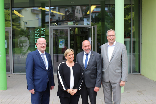 Im anschließenden Gespräch der Ministerin mit Bürgermeister Frank Volk (Neckargemünd), Joachim Philipp, Schulleiter des Max-Born-Gymnasiums und Marion Marker-Schrotz, geschäftsführende Schulleiterin der Realschule Neckargemünd, ging es unter anderem um die Digitalisierung der Schule. Schütte machte deutlich, dass Land und Bund im Rahmen des Digitalpakts erhebliche Mittel für die Digitalisierung bereitstellen. In der Summe pro Schüler ca. 500 Euro, für Neckargemünd also über 600.000 Euro. Bürgermeister Volk betonte, dass die Stadt Neckargemünd bereits viel in die Digitalisierung investiert habe. Bevor man die Mittel sinnvoll verwenden könne, müsse die Schule als Ganzes auch an das schnelle Internet angebunden werden. Hierzu sei man im Gespräch mit dem Zweckverband fibernet, der dafür Zuschüsse aus dem Innenministerium des Landes erhalte.