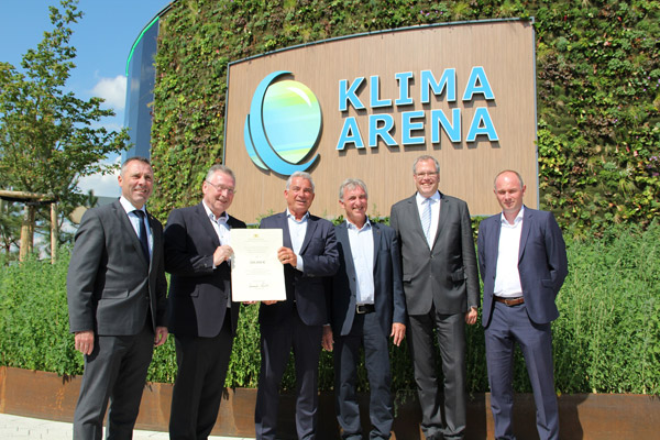 Dieses herausragende finanzielle Engagement eines privaten Mäzens war für die CDU-Landtagsfraktion und insbesondere die Abgeordneten Karl Klein und Dr. Albrecht Schütte Ansporn, sich für eine Anerkennung einzusetzen. Zusammen mit den beiden Abgeordneten nutzte Landesinnenminister Strobl den Rundgang durch das weitgehend fertiggestellte, als Plusenergiehaus konzipierte Gebäude, um einen Förderbescheid seines Ministeriums für den „Klimaglobus“ an Alfred Erhard, sowie Vorstand Christian Ledig zu übergeben. In Kooperation mit der Europäischen Weltraumorganisation ESA, die der Klima Arena Echtzeitdaten zur Verfügung stelle, wolle man, so Erhard, Wetterphänomene auf dem futuristisch anmutenden, mehrere Meter großen Globus darstellen und so für die Besucher der Ausstellung erfahrbar machen.