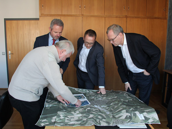 Bildunterschrift (v.l.n.r.): Hans Sonnentag, 1. Bürgermeisterstellvertreter Meckesheim, Bürgermeister Maik Brand (Meckesheim), Bürgermeister Hagen Zuber (Zuzenhausen), Dr. Albrecht Schütte (Landtagsabgeordneter).Auf der von Schütte organisierten Radtour im vergangenen Sommer hatte man mögliche Strecken zwischen den beiden Gemeinden an der B 45 und dem Schreinerdorf bereits in Augenschein genommen. Damals konnte Schütte schon darauf hinweisen, dass vom Land für die Schaffung von Radwegen durch kommunale Träger ein Zuschuss von 50% gewährt werde.
