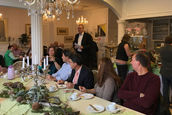 Große Resonanz fand das erste „Politische Frühstück“ mit dem Landtagsabgeordneten Dr. Albrecht Schütte (CDU) im Café „Blumen am Schloss“ in Angelbachtal. Knapp 40 Besucher waren gekommen, um sich über die Themen Bildung, Verkehr und Digitalisierung zu informieren und darüber bei einem gemeinsamen Frühstück ins Gespräch zu kommen. Nach einleitenden Worten von Stephanie Brecht, Vorsitzende der CDU Angelbachtal, wurde das Frühstücksbuffet eröffnet und die Teilnehmer waren bereits gestärkt, als Dr. Albrecht Schütte das Wort ergriff. Er informierte in drei Kurzvorträgen, was sowohl auf landes- als auch auf bundespolitischer Ebene in den Bereichen Bildung, Verkehr und Digitalisierung aktuell geleistet werde sowie für die Zukunft geplant sei.