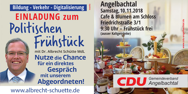 Herzliche Einladung der CDU Angelbachtal zu einem „Politischen Frühstück“ mit Dr. Albrecht Schütte MdL im „Café und Blumen am Schloss“, Angelbachtal. Dr. Schütte wird über Bildung, Verkehr und Digitalisierung sprechen und gerne Ihre Fragen beantworten.