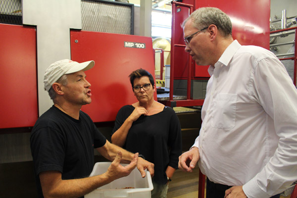 Mit Michaela Falter, die den CDU-Parlamentarier zusammen mit den beiden Geschäftsführern Gitta und Lothar Falter durch die Produktionsstätte führte, folgte Schütte den eigenen Früchten auf dem Weg zum fertigen Apfelsaft. Vorbei an einer Wasch- und Sortieranlage, bei Falter wird das ankommende Obst noch per Hand aussortiert, führt der Weg der Äpfel nach der Zerkleinerung in eine der drei Obstpressen – bis zu 200 Tonnen Äpfel können so in 24 Stunden verarbeitet und zu Saft gepresst werden.