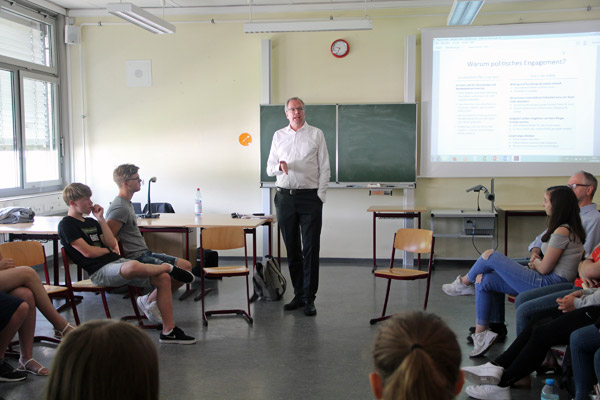 Zunächst stellte der Parlamentarier sich und seine politische Schwerpunktsetzung vor. Dabei betonte er, wie wichtig Erlernen und Tätigkeit in einem Beruf sei, bevor man in die Politik „einsteige“. So habe man ein sicheres Standbein neben dem Abgeordnetendasein und wäre von diesem nicht abhängig. Zudem warb er dafür, sich für Demokratie und Rechtsstaat einzusetzen, die nicht überall selbstverständlich seien. Zur Demokratie gehöre mehr, als nur ein Kreuz auf einem Wahlzettel zu setzen. Es sei ein Privileg, dass man in Deutschland unbeeinflusst und ohne Zwang aktiv an Wahlen und politischen Diskussionen teilnehmen könne.