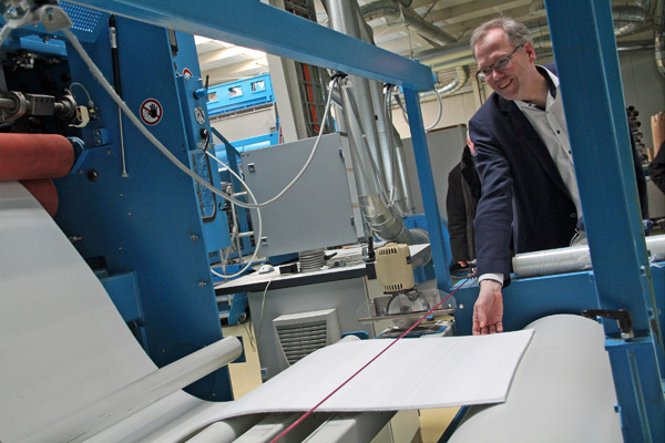 Bei einem Rundgang über das Gelände besichtigten die Teilnehmer unter anderem eine Komplettanlage im Technologiezentrum. Aus Fasern wird zunächst ein lockeres Vlies geformt, das in nachfolgenden Nadelmaschinen verdichtet und zum Nadelvliesstoff verfestigt wird. Die DiloGroup bietet Komplettanlagen für diesen Vorgang aus einer Hand mit Projektierung, Produktion, Inbetriebnahme und Wartung an. Dabei kann die Arbeitsbreite der Maschinen zum Beispiel zur Geotextilherstellung 8 m betragen; einzelne Großnadelmaschinen zur Papierfilzherstellung sind noch breiter und wiegen auch mal bis zu 900 Tonnen. Zum Abschluss stellte der Firmeninhaber Produkte aus Vlies vor: Neben Pflegetüchern, Windeln und verschiedenen medizinischen Produkten sind dies in der Hauptsache Nadelvliesstoffe für Automobilformteile, Bodenbeläge, Filtermedien, Geotextilien oder Schuhmaterialien. (Text/Fotos: Christine Nahrgang)