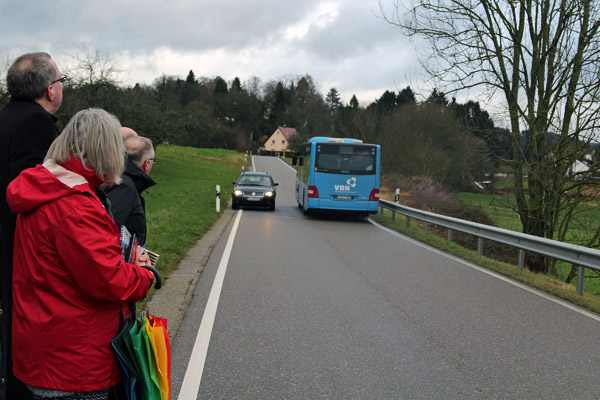 Rüdiger Ruf, der sich seit Jahrzehnten für eine Verbesserung der Situation einsetzt, zeigte mit einem Metermaß die geringe Breite der Straße, auf der zwischen den beiden Orten laut (Nicht-)Beschilderung formal 100 Stundenkilometer erlaubt sind. Dass hier bei Begegnung zum Beispiel von Bus und einem PKW, ein Fahrzeug am Rand halten muss, konnte man vor Ort direkt sehen. Klar war für alle Beteiligten die besondere Gefährlichkeit dieser Situation für Fußgänger und Radfahrer.
