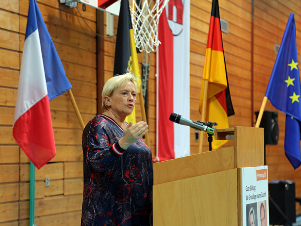 Früher sei Baden-Württemberg bei der Bildung bundesweit mit an der Spitze gewesen, mittlerweile habe man nur noch einen Platz im Mittelfeld inne. Von Schuldzuweisungen sah Eisenmann ab, stellte indes fest: „Bildungspolitik geht nicht im Hauruckverfahren, man braucht Ruhe und Verlässlichkeit.“ Die Grundschule sei besonders wichtig: „Auf den Anfang kommt es an.“ Ein besonderes Augenmerk habe sie auf die Kernkompetenzen Lesen, Schreiben und Rechnen: „Diese Grundlagen tragen für das ganze Leben.“ „Ich habe die Aufregung nicht verstanden, als ich entschieden habe, dass das gemacht wird, was auch in anderen Bundesländern gemacht wird: Rechtschreibung wird wieder ab Klasse 1 korrigiert“, so die Kultusministerin unter dem starken Beifall ihrer Zuhörer. Lernmethoden wie Schreiben nach Gehör erteilte sie eine klare Absage.