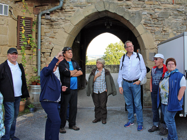 Nach drei Stunden erreichte die Gruppe die Burg Steinsberg und wurde dort mit einer Führung durch die Burg und einem wunderschönen Ausblick über Sinsheim belohnt. Der „Kompass des Kraichgaus“, wie die Burg schon seit dem Bauerkrieg genannt wird, liegt in 333 Metern Höhe auf einem ehemaligen Vulkan, dessen nährreicher Boden heute zum Weinanbau genutzt wird.