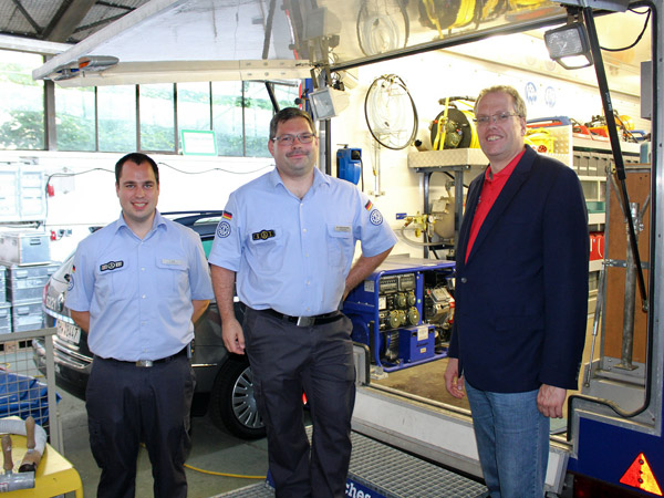 Neckargemünd. Seine Sommertour nutzte Dr. Albrecht Schütte MdL, um sich beim THW Neckargemünd über dessen Fuhrpark, typische Einsätze und den Stand des Neubaus zu informieren. In den mittlerweile seit 1993 genutzten Räumlichkeiten in der Wiesenbacher Straße begrüßten der Ortsbeauftragte des THW Michael Willenbacher und sein Stellvertreter Thomas Ruf den CDU-Parlamentarier Schütte, der im Ehrenamt Vorsitzender der DLRG Bammental ist.