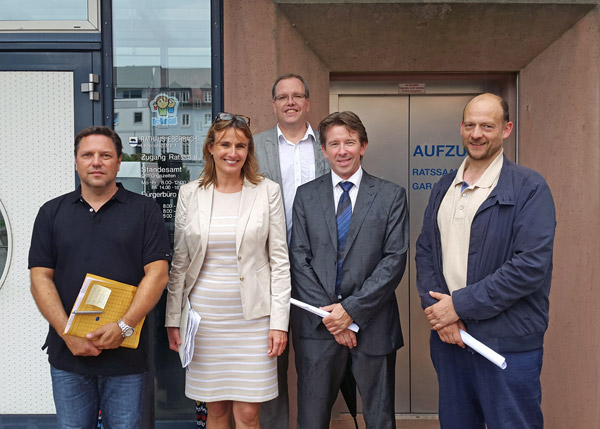 Stadtbaumeister Steffen Koch, Staatssekretärin Katrin Schütz, Dr. Albrecht Schütte MdL, stellvertr. Bürgermeister Michael Reinig und Gemeinderat und CDU-Vorsitzender Georg Hellmuth.