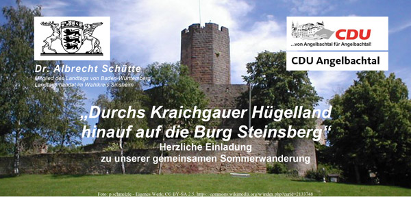 Sehr geehrte Damen und Herren, herzlich laden wir alle wanderfreudigen Bürgerinnen und Bürger zu einer gemeinsamen Wandertour unter dem Motto „Durchs Kraichgauer Hügelland hinauf auf die Burg Steinsberg“ ein. Gemeinsam wollen wir von Angelbachtal aus startend entlang der Felder und durch die Wälder Richtung Hammerau laufen. Der kurze Anstieg zum Abschluss wird durch den wunderschönen Ausblick von der Burg Steinsberg über Sinsheim und den Kraichgau belohnt. Wir freuen uns auf Sie und darauf, mit Ihnen beim Wandern und gemütlichen Beisammensein persönlich ins Gespräch zu kommen.