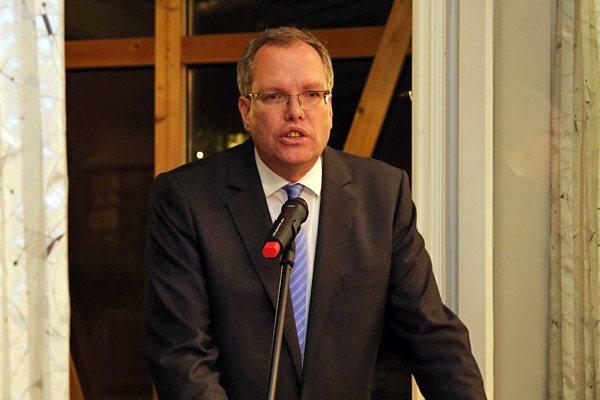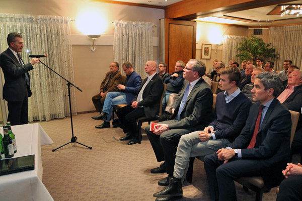 Gleich zu Beginn überreichte Bürgermeister Dieter Steinbrenner einen Präsentkorb mit regionalen Produkten aus Zuzenhausen. „Normalerweise übergibt man ein solches Geschenk erst am Ende einer Veranstaltung und wartet ab, ob der Redner gut war. Bei Herr Oettinger weiß ich, dass er per se gut ist“, betonte Steinbrenner, der sich freute, Oettinger nun schon zum dritten Mal in seiner Gemeinde begrüßen zu dürfen. Bis zu diesem Zeitpunkt sei jedoch noch keine Gelegenheit gewesen, dass sich Herr Kommissar in das Gästebuch des Ortes einzutragen.