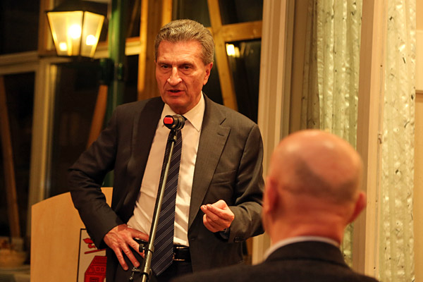Die digitale Revolution sei eine schnelle und umwälzende Veränderung und man müsse dafür sorgen, dass Deutschland hier mithalten könne. „Wir brauchen Investitionen in die digitale Infrastruktur – das geht jedoch nicht allein auf nationaler Ebene“, erklärte Oettinger. Es sei nicht zeitgemäß, dass auf dem Weg von Zuzenhausen nach beispielsweise Florenz kein einziges Mal der Pass kontrolliert werde, aber bei dem Überschreiten einer Grenze jedes Mal ein fünfminütiges Funkloch aufkommen würde. Man müsse das Netz europäisieren, sonst sehe Oettinger schwarz für neue Technologien. „Keiner wird seinen Arbeitsplatz halten können, wenn er nicht mit der digitalen Revolution mithalten kann“, betonte Oettinger. Er animierte die Zuhörerschaft, sich demnächst zu einem Computerkurs anzumelden und sich in diesem wichtigen Bereich weiterzubilden.