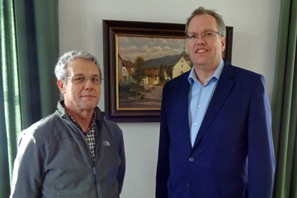 Mit 470 Einwohnern ist Heddesbach die kleinste selbstständige Gemeinde im Rhein-Neckar-Kreis und fast komplett von hessischen Ortschaften umgeben. Um sich über die speziellen Anliegen des Ortes im Laxbachtal zu informieren, besuchte Landtagskandidat Dr. Albrecht Schütte (CDU) Bürgermeister Hermann Roth. Neben dem gemeinsamen politischen Ehrenamt – Schütte ist seit über Jahrzehnten Gemeinderat in seiner Heimatgemeinde – verbindet beide langjährige Erfahrungen aus dem Berufsleben in der Industrie. So fiel im Gespräch ab und an mit einem Schmunzeln der Hinweis: „Das hätte man in der Wirtschaft vermutlich doch etwas schneller umgesetzt.“