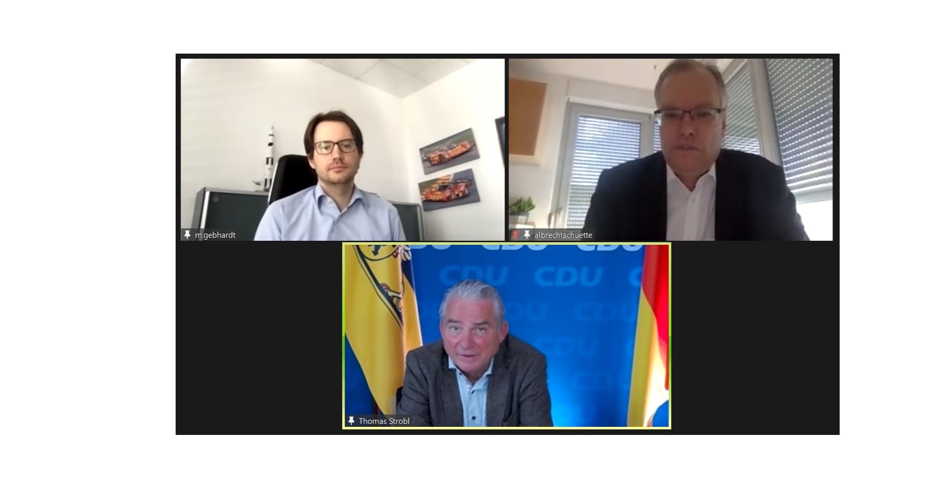 Landtagsabgeordnete Dr. Albrecht Schütte MdL und Thomas Strobl, Stv. Ministerpräsident und Digitalisierungsminister, zu einem virtuellen Firmenbesuch bei der Firma Gebhardt Fördertechnik.