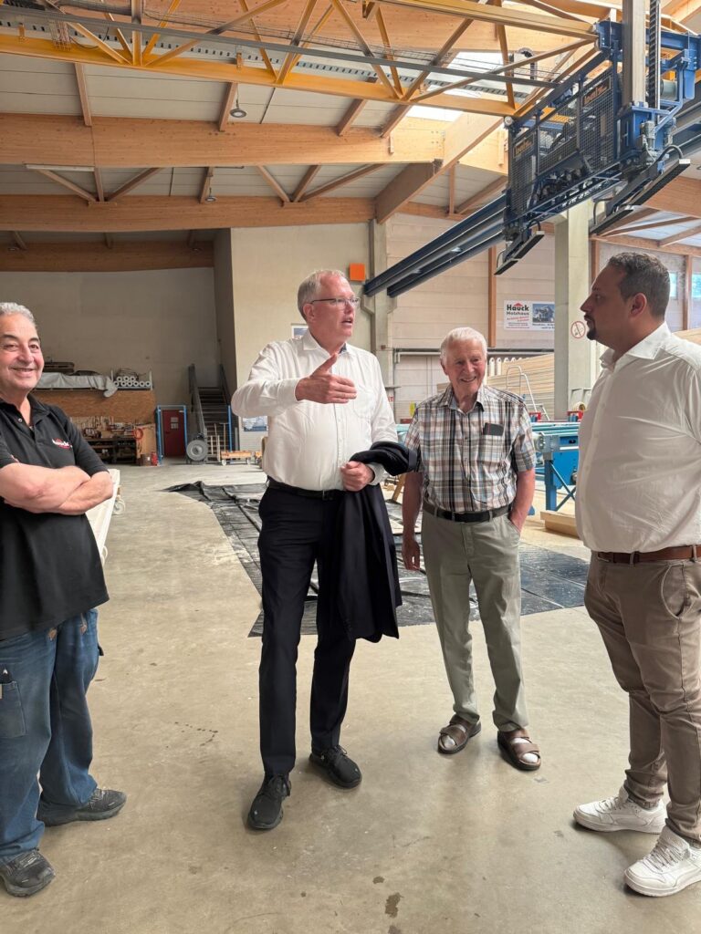 Wie sich modernes Bauen mit Nachhaltigkeit und innovativen Technologien erfolgreich verbinden lässt, konnte Dr. Albrecht Schütte MdL beim Betriebsbesuch bei der Firma Hauck Holzbau in Neckarbischofsheim erfahren. Gemeinsam mit Bürgermeister Thomas Seidelmann und Altbürgermeister Günter Burkhardt machte sich der Abgeordnete ein Bild von dem Familienunternehmen, welches Teile für komplette Häuser baut, die dann vor Ort nur noch zusammengesetzt werden müssen oder für Zimmereibetriebe das Holz für die Dachstühle etc. zusägt.