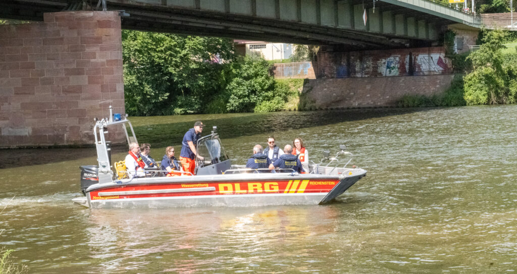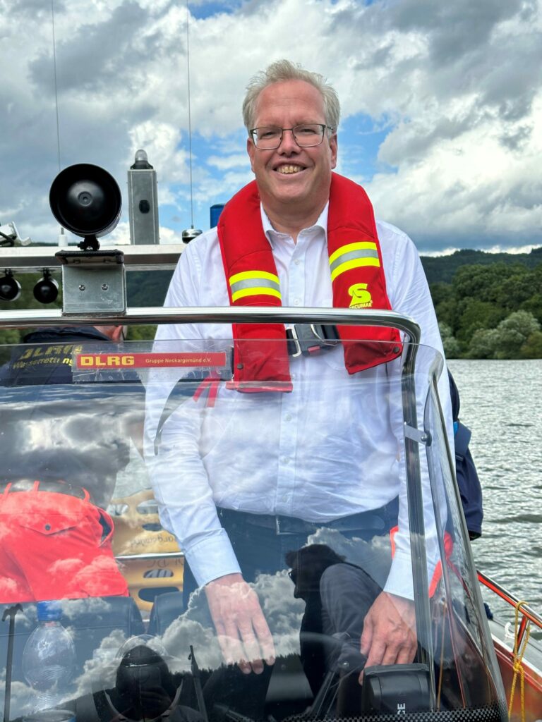 Im Rahmen der Ehrenamtstour war der nächste Stopp der DLRG Neckargemünd. Auf dem Wasser tauschten sich Hagel und Schütte sowie der Bundestagsabgeordnete Moritz Oppelt mit Detlev Sy, Vorsitzender des Vereins, und weiteren Mitgliedern über die Aufgaben der Deutschen Lebens-Rettungs-Gesellschaft (DLRG) aus.