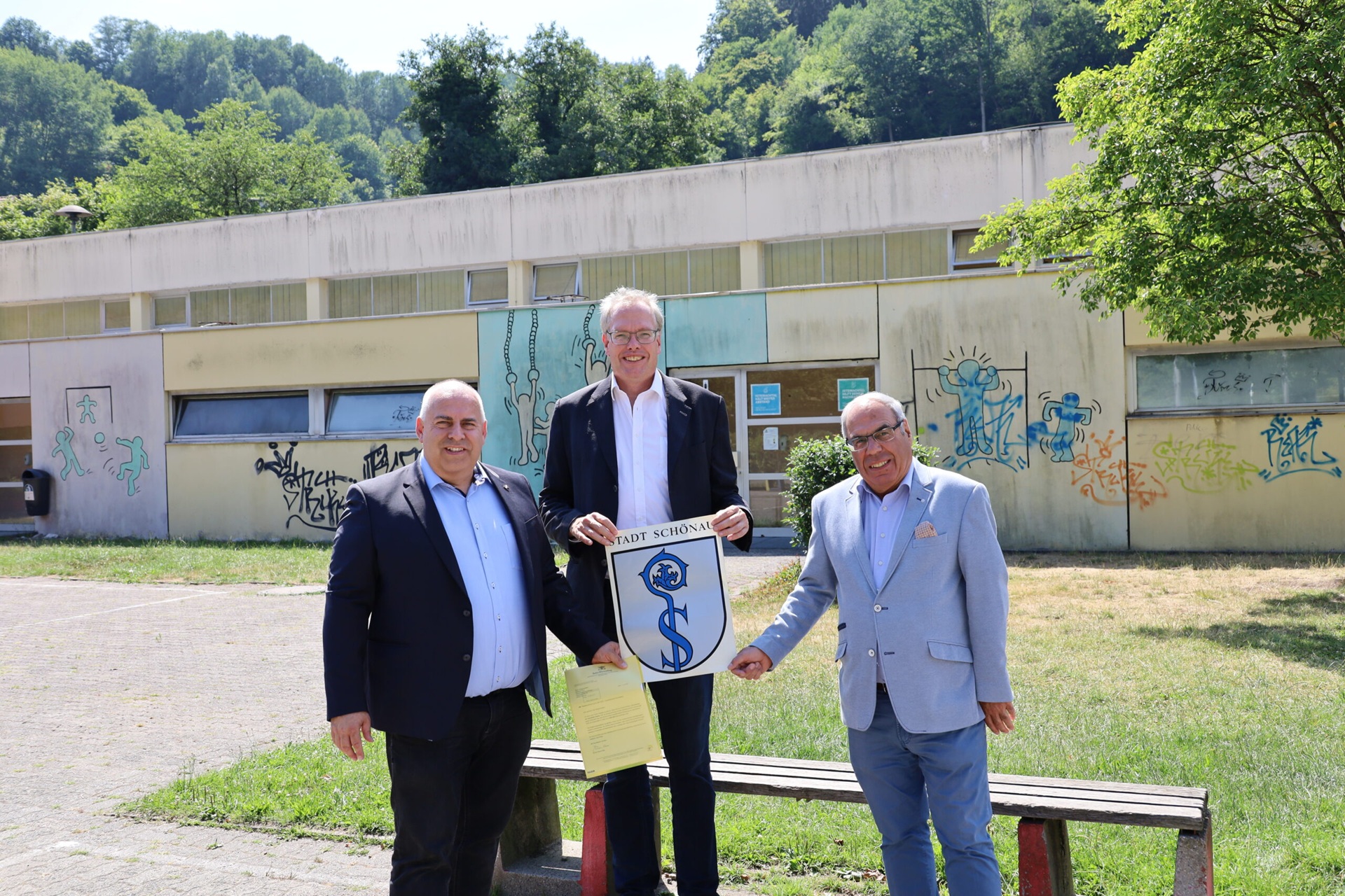 Bürgermeister Matthias Frick, Dr. Albrecht Schütte MdL und Heinrich Ludwig Runz freuen sich über Förderungsbescheid zur Hallensanierung