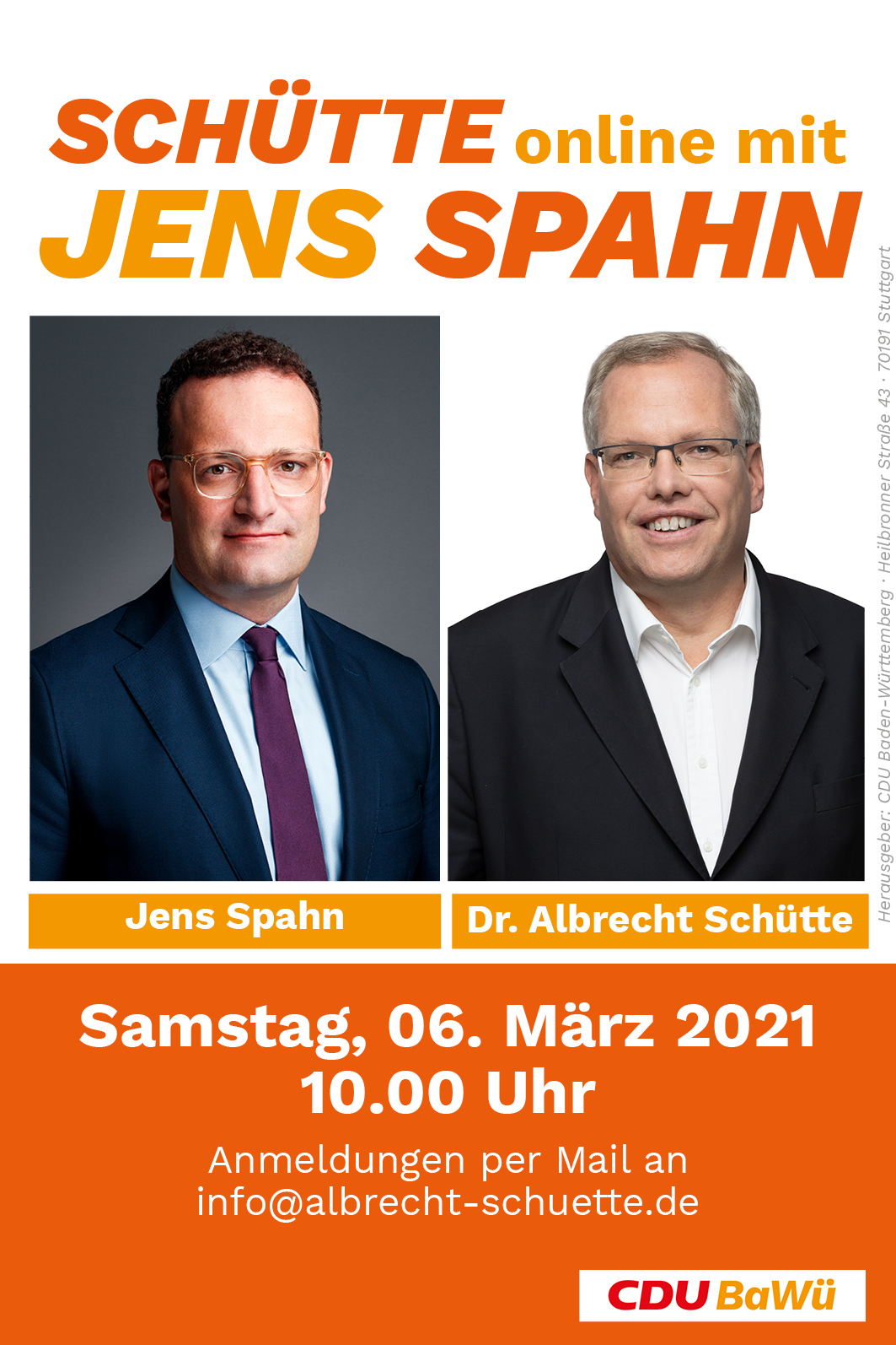 Seit fast einem Jahr beschäftigt die Corona-Pandemie das Land und die Politik – ob im Landtag von Baden-Württemberg oder im Deutschen Bundestag. Um sich über Herausforderungen in der Pandemiebekämpfung, dem aktuellen Stand der Impfkampagne und über eine Perspektive für die nächsten Wochen und Monate auszutauschen, veranstaltet der CDU-Landtagsabgeordnete Dr. Albrecht Schütte ein digitales Gespräch mit Bundesgesundheitsminister Jens Spahn MdB. Der Austausch findet in Form eines Facebook Live-Videos am Samstag, 06. März um 10 Uhr statt.