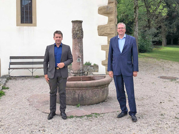 Zu einem ersten Gespräch mit dem neugewählten Neckarbischofsheimer Bürgermeister Thomas Seidelmann war der örtliche Landtagsabgeordnete Dr. Albrecht Schütte (CDU) in das wunderschöne Städtchen gekommen. Im malerischen Schloßpark unterhielten sich die beiden über wesentliche Anliegen der Kommune und das Potential für die Zukunft. Dabei konnte Schütte auf vielfältige Förderprogramme hinweisen, die in den letzten Jahren genutzt wurden und der Gemeinde auch in Zukunft offen stehen. „Dazu kommen“, so der Abgeordnete, „zusätzliche Mittel für Neckarbischofsheim in Höhe von 50 000 Euro pro Jahr aufgrund des neu eingeführten sogenannten Flächenfaktors.“ Letzteres sei eine harte Auseinandersetzung gewesen, für die es weder vom Städtetag noch vom Koalitionspartner Beifall gegeben habe, erinnerte Schütte sich an harte Auseinandersetzung bei dieser Stärkung des Ländlichen Raumes.