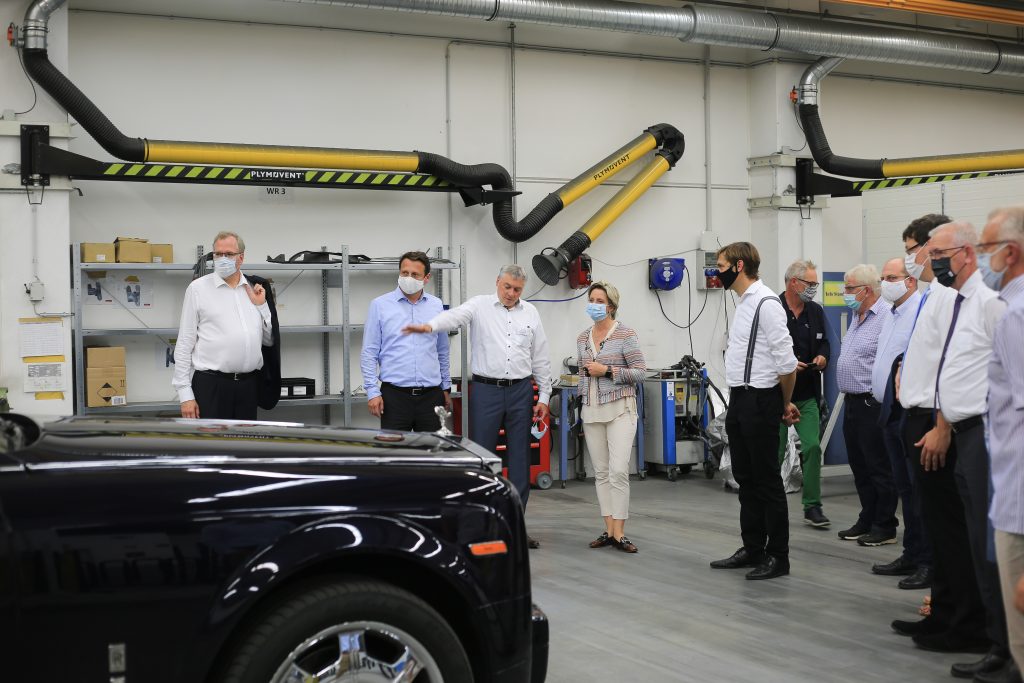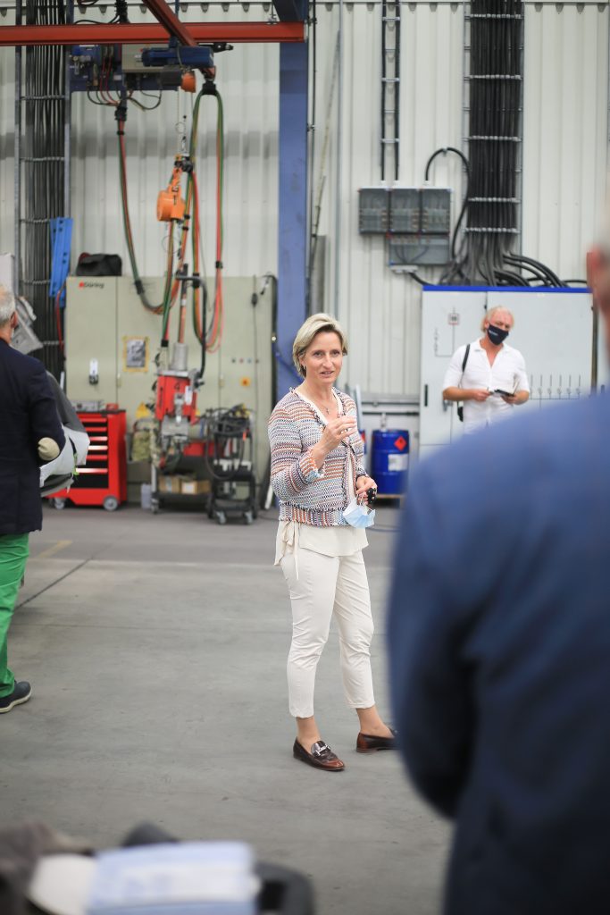 Anschließend machten sich Ministerin, Landtagsabgeordneter und Kommunalpolitik ein Bild von der Niederlassung des finnischen Entwicklungs- und Fertigungsdienstleisters „Valmet Automotive“. Deutschland-Geschäftsführer Dr. Robert Hentschel und Klaus Wetzstein, Betriebsleiter in Helmstadt-Bargen, stellten zunächst die Pläne für den Standort vor: „Hier in Helmstadt-Bargen wird zukünftig die Batterieentwicklung der „Valmet Automotive“-Gruppe stattfinden, ein echtes Zukunftsthema. Denn klar ist: Die Nachfrage nach elektrischen Kleinfahrzeugen wird mittelfristig deutlich zunehmen.“ Nach einem Rundgang durch die Produktionshallen, die bei laufdender Produktion momentan erweitert und modernisiert werden, bedankte sich Bürgermeister Jürriens bei Wirtschaftsministerin Dr. Hoffmeister-Kraut für die Bereitschaft, das Zapf-Gelände in Helmstadt-Bargen und die dort angesiedelten Unternehmen zu besichtigen.