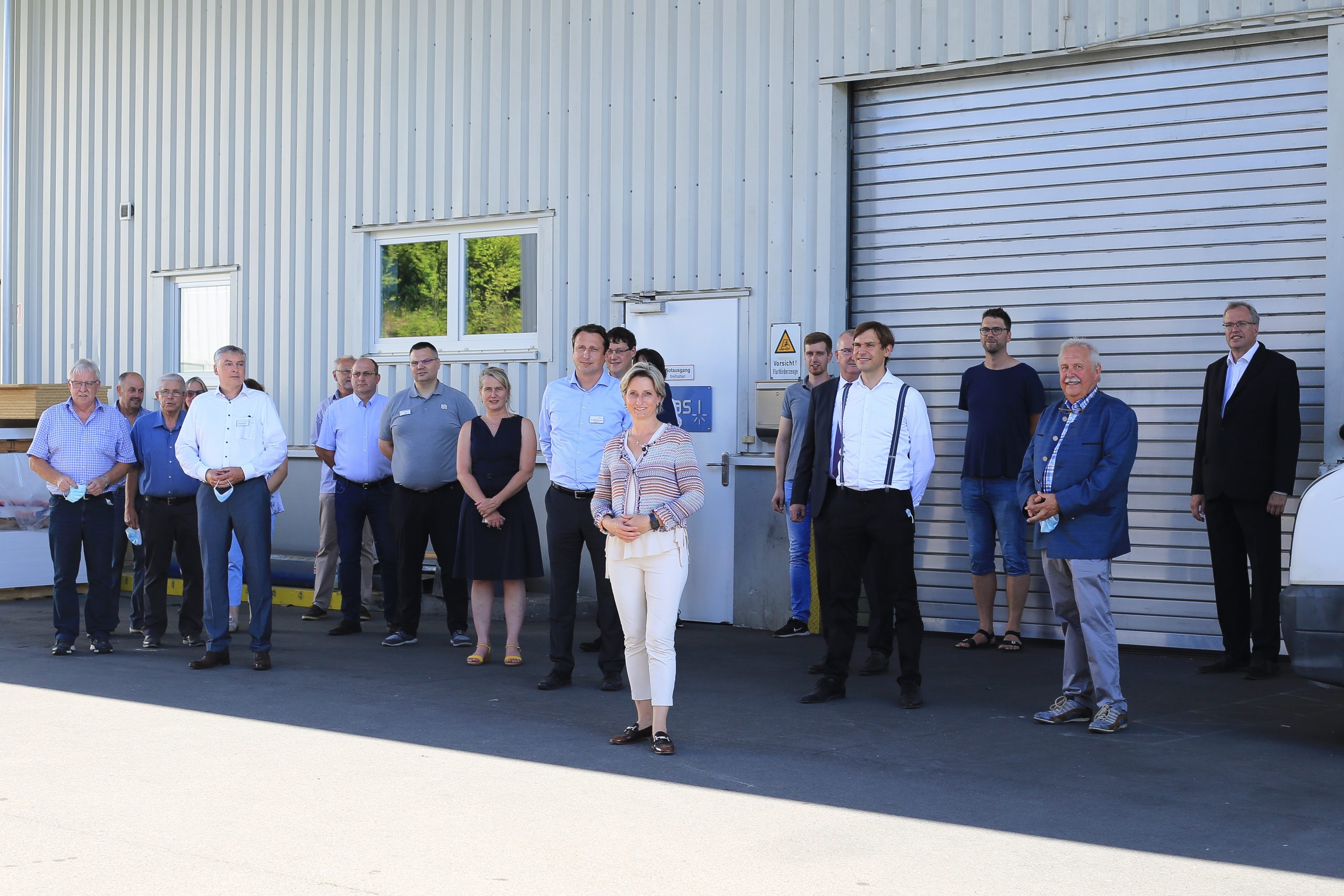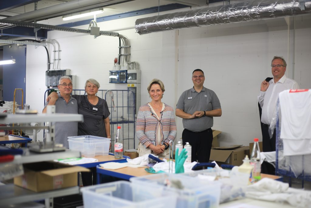 Mit genügend Abstand und unter Einhaltung der Abstands- und Hygieneregelungen führte Moritz Zapf die Wirtschaftsministerin schließlich durch einige der wieder angesiedelten Unternehmen, darunter die „11 Teamsports Print GmbH“. 1991 durch die Familie Rajakov gegründet, produziert und appliziert das Unternehmen, geleitet von Geschäftsführer Dalibor Rajakov, Veredelungen und Bedrucke für Sportbekleidung sowie -textilien.