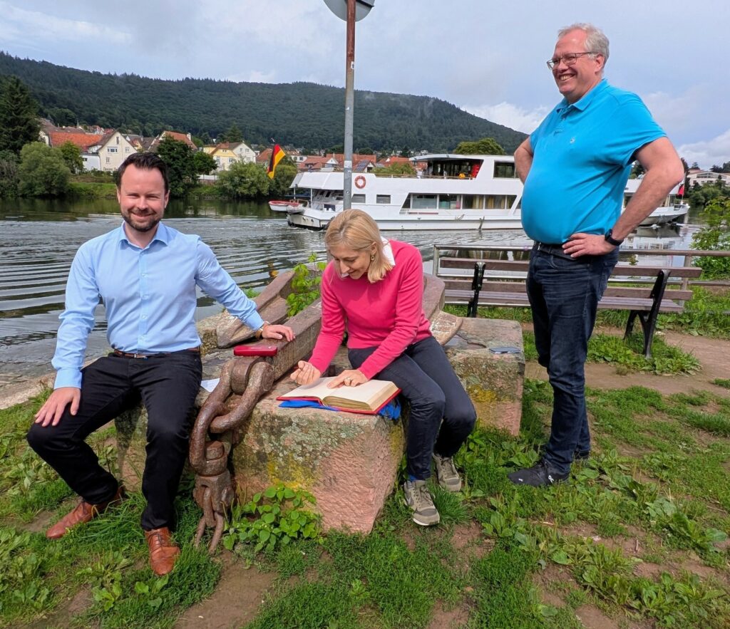 Das Goldene Buch der Gemeinde Neckargemünd liegt passenderweise auf einem Ankerdenkmal am Flussufer bereit. Es ist der erste Besuch von Nina Warken in ihrer Funktion als Bundesgesundheitsministerin. Bürgermeister Jan Peter Seidel freut sich, dass nun auch das Regierungsmitglied in seinem Buch zu finden ist.