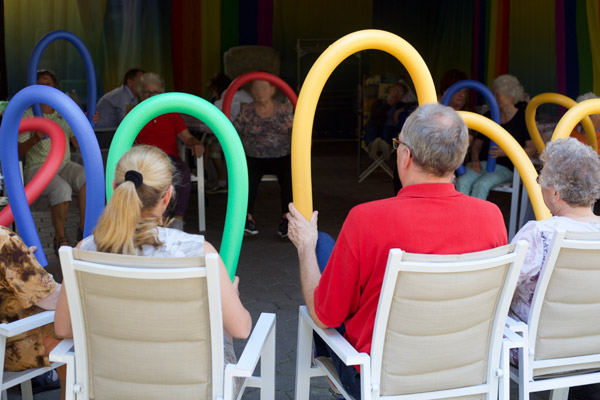 Den Gästen, die häufig demenzkrank seien, würde in der Einrichtung ein abwechslungsreiches Programm angeboten, führte Trautmann in den Tagesablauf ein. Jeden Morgen beginne man nach einem gemeinsamen Frühstück mit einer kleinen Vorstellungsrunde, bei dem die Gäste ihren Namen und ihren Wohnort nennen. Anschließend mache man unter anderem gemeinsam Einheiten zum Thema Gymnastik- und Gedächtnistraining. „Die Gäste sind gut betreut und sind so nicht einsam. Bei uns wird viel gesungen und gelacht. Wir haben Spaß“, schwärmte Trautmann. Davon konnte sich Schütte selbst überzeugen, der an dem Morgenkreis und den Gymnastik- und Gedächtnisübungen teilnahm. Passend zu dem heißen Wetter hatten die Übungen das Thema „Schwimmbad“, wobei sich Schütte als DLRG-Vorsitzender direkt in seinem Element fühlte.