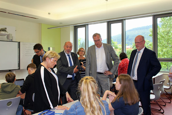 Im anschließenden Gespräch der Ministerin mit Bürgermeister Frank Volk (Neckargemünd), Joachim Philipp, Schulleiter des Max-Born-Gymnasiums und Marion Marker-Schrotz, geschäftsführende Schulleiterin der Realschule Neckargemünd, ging es unter anderem um die Digitalisierung der Schule. Schütte machte deutlich, dass Land und Bund im Rahmen des Digitalpakts erhebliche Mittel für die Digitalisierung bereitstellen. In der Summe pro Schüler ca. 500 Euro, für Neckargemünd also über 600.000 Euro. Bürgermeister Volk betonte, dass die Stadt Neckargemünd bereits viel in die Digitalisierung investiert habe. Bevor man die Mittel sinnvoll verwenden könne, müsse die Schule als Ganzes auch an das schnelle Internet angebunden werden. Hierzu sei man im Gespräch mit dem Zweckverband fibernet, der dafür Zuschüsse aus dem Innenministerium des Landes erhalte.