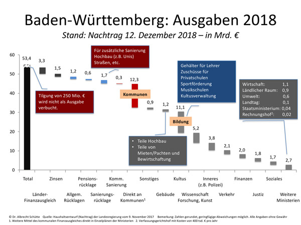 Am 12. Dezember hat der Landtag in zweiter und dritter Lesung den Nachtrag endgültig verabschiedet. Mit dabei der Sinsheimer Abgeordnete Dr. Albrecht Schütte: „Die Schuldentilgung erhöht sich in den 2 Jahren von 1 Mrd. auf 1,25 Mrd. €. Kombiniert mit der Ablösung sogenannter Kreditermächtigung, wird das Land Ende 2019 um 2,75 Mrd. Euro weniger in der Kreide stehen als nur 24 Monate vorher.“