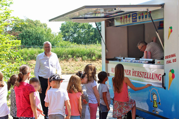 Nun löste der Parlamentarier sein Versprechen ein und hatte eine ganz besondere Überraschung für die Schülerinnen und Schüler parat: Anstatt mit ihnen Eis essen zu gehen, hatte er einen Eiswagen organisiert, der in der großen Pause auf den Ansturm wartete. Bei strahlendem Sonnenschein lud Schütte alle Schülerinnen und Schüler sowie deren Lehrerinnen auf ein kühlendes Eis aus „Nicos Eiswagen“ ein. Schulleiterin Nicole Fink bedankte sich im Namen aller Schüler und Lehrerinnen bei dem Abgeordneten.