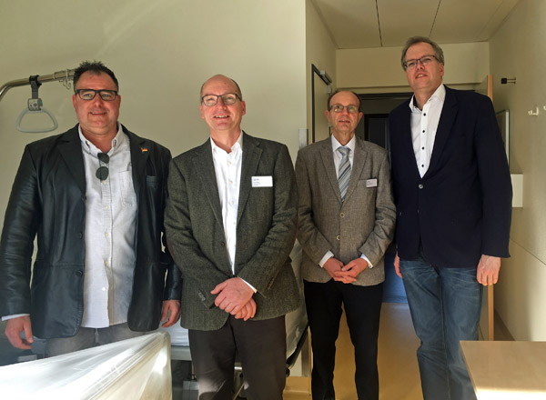 Auf dem Foto von links nach rechts: Dr. Patrick Schottmüller (Notarzt am Standort Eberbach), Ralf Geiger und Martin Hildenbrand (Leitung GRN-Klinik Eberbach) und Dr. Albrecht Schütte MdL.