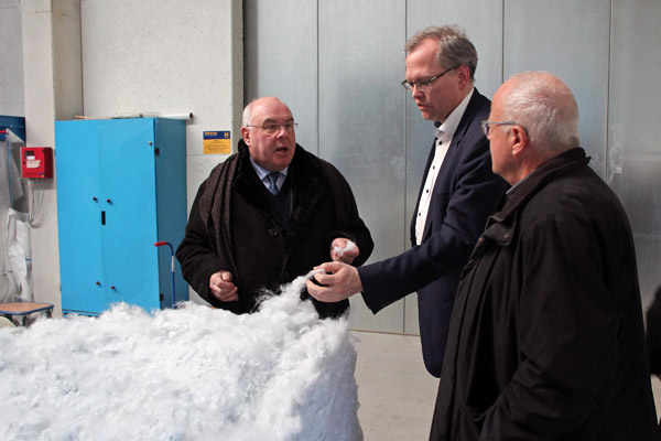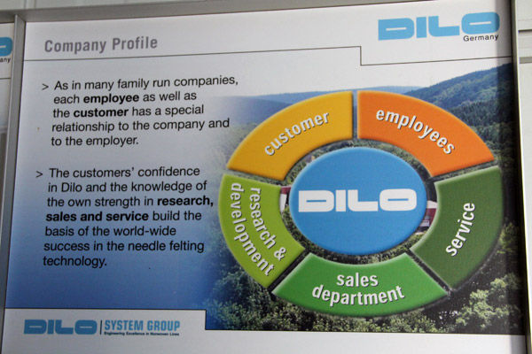 Bei einem Rundgang über das Gelände besichtigten die Teilnehmer unter anderem eine Komplettanlage im Technologiezentrum. Aus Fasern wird zunächst ein lockeres Vlies geformt, das in nachfolgenden Nadelmaschinen verdichtet und zum Nadelvliesstoff verfestigt wird. Die DiloGroup bietet Komplettanlagen für diesen Vorgang aus einer Hand mit Projektierung, Produktion, Inbetriebnahme und Wartung an. Dabei kann die Arbeitsbreite der Maschinen zum Beispiel zur Geotextilherstellung 8 m betragen; einzelne Großnadelmaschinen zur Papierfilzherstellung sind noch breiter und wiegen auch mal bis zu 900 Tonnen. Zum Abschluss stellte der Firmeninhaber Produkte aus Vlies vor: Neben Pflegetüchern, Windeln und verschiedenen medizinischen Produkten sind dies in der Hauptsache Nadelvliesstoffe für Automobilformteile, Bodenbeläge, Filtermedien, Geotextilien oder Schuhmaterialien. (Text/Fotos: Christine Nahrgang)