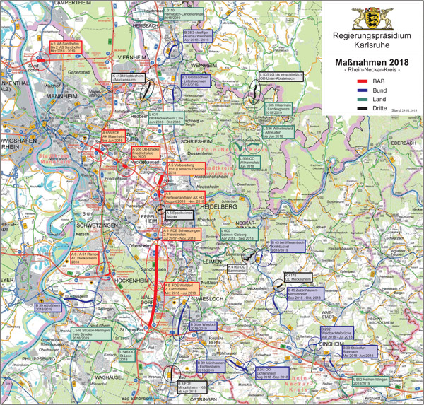 Wie das Regierungspräsidium Karlsruhe bekannt gab, werden Bund und Land auch dieses Jahr wieder erhebliche Mittel in die Erhaltung des Straßennetzes in der Metropolregion Rhein-Neckar einsetzen. Hierdurch können wiederum viele Bundes- und Landesstraßen im Rhein-Neckar-Kreis, dem Neckar-Odenwald-Kreis sowie den Städten Heidelberg und Mannheim saniert und erneuert werden. Nahezu während des ganzen Jahres werden zahlreiche Baustellen in der Region vorhanden sein.