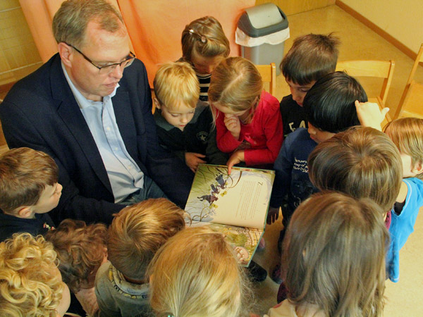„Mir selbst macht das Vorlesen jedes Mal viel Freude.“ Mitgebracht hatte Schütte das Bilderbuch „Der kleine Wassermann“ von den Autoren Otfried Preußler und Regine Stigloher, illustriert von Daniel Napp. Daraus las er die Geschichte „Frühling im Mühlenweiher“ vor. Das Bilderbuchabenteuer handelt von dem Leben des kleinen Wassermanns, seiner Familie und seinen Freunden. Als die ersten wärmenden Sonnenstrahlen den Grund des Mühlenweihers erreichen, erwacht auch der kleine Wassermann aus dem Winterschlaf. Neugierig und voller Tatendrang macht er sich nach dem Frühstück auf, um seine Umgebung zu erkunden.