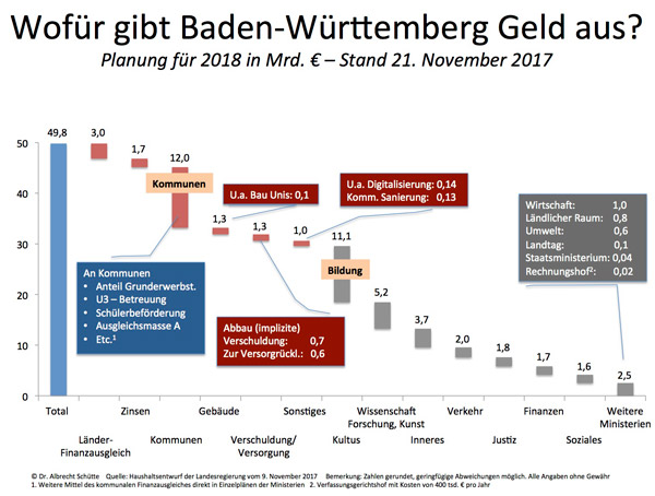 Am morgigen Mittwoch, 22. November 2017 beginnen im Finanzausschuss des Landtags die Beratungen für den Doppelhaushalt 2018/19 für Baden-Württemberg. Neben den Zuschüssen und Zuweisungen an die Kommunen von über 12 Milliarden Euro, sind der Kultusetat mit gut 11 Milliarden Euro und der Etat des Ministeriums für Wissenschaft, Forschung und Kunst mit 5,2 Milliarden Euro die größten Einzelposten im Haushalt. Dr. Albrecht Schütte, stellvertretender finanzpolitischer Sprecher der CDU-Fraktion, freut sich auf die intensive Diskussion und weitere Verbesserungen bei der Verteilung der Landesmittel für 2018 und 2019.