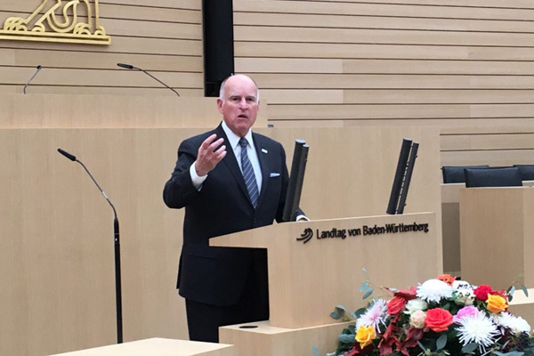 Der kalifornische Gouverneur Edmund G. „Jerry“ Brown Jr., prominenter Verfechter einer nachhaltigen Klimaschutzpolitik, sprach am heutigen Mittwoch, 8. November 2017, im Landtag von Baden-Württemberg. Vor Parlamentariern aller fünf Fraktionen, Vertreter des Jugendlandtags sowie geladenen Zuhörern dankte der 79-Jährige Demokrat Baden-Württemberg ausdrücklich für die „führende Rolle“ in der Klimaschutzpolitik: „Dass unsere Länder sich zusammentun, um eine weltweite Kraft zu begründen, ist einfach unglaublich!“ Landtagspräsidentin Muhterem Aras (Grüne) bekräftigte: „Sie erhalten für Ihre Arbeit breiten Rückhalt aus der baden-württembergischen Politik.“