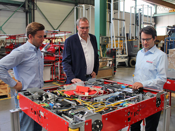 Vor Ort in der Halle zeigte der Geschäftsführer dem CDU-Parlamentarier konkret, wie Gebhardt Fördertechnik die Digitalisierung und damit die nächsten Jahre angehen werde: Die Entwicklung und der Bau von selbstnavigierenden, autonom fahrenden Transportrobotern, die sowohl herkömmliche Palettenfördertechnik als auch klassische Hubwagen ersetzen werden, sei für das Unternehmen enorm wichtig, so Gebhardt.